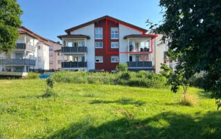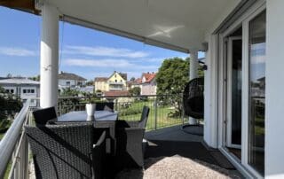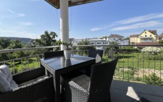 Der Balkon mit Blick ins Grüne ist eine Oase der Erholung – ideal für den Morgenkaffee oder laue Sommerabende.