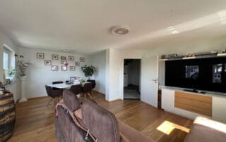 Schon beim Betreten der Wohnung wird man mit Helligkeit und einer einladenden Atmosphäre empfangen. Das Herzstück bildet der großzügige Wohn-Essbereich, der viel Raum für gemeinsame Zeit mit Familie und Freunden bietet. Große Fensterelemente durchfluten den Raum mit Tageslicht und machen ihn zu etwas ganz Besonderem. Die angrenzende Küche ist mit einem Induktionsherd sowie hochwertigen Geräten der Marken Miele, Neff und Blaupunkt ausgestattet – hier bleibt kein Wunsch offen. Ein Highlight stellt die integrierte Speisekammer dar, die nicht nur praktischen Stauraum bietet, sondern auch den Küchenalltag spürbar erleichtert.