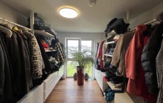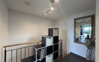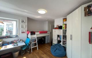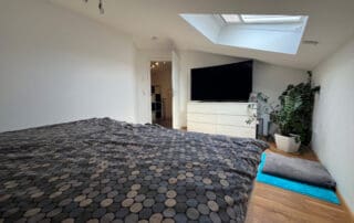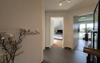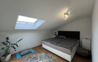Im Dachgeschoss setzt sich dieses stimmige Konzept fort: Hier finden Sie ein Schlafzimmer mit angrenzender Ankleide – ein echtes Plus an Komfort und Stauraum. Auch hier wurden Diele und Badezimmer mit Fliesen, Ankleide und Schlafzimmer mit Parkettboden hochwertig ausgestattet.