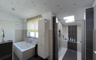 Tageslichtbad mit großer, begehbarer Dusche und Badewanne |