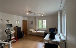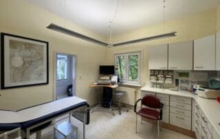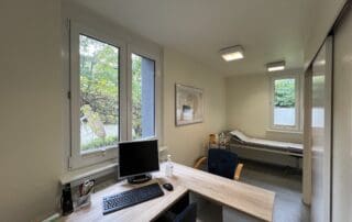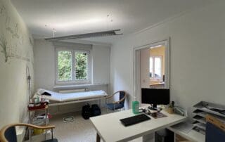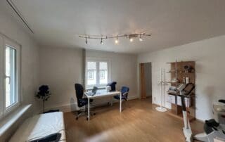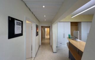 Die Arztpraxis hat zur Straßenseite hin einen separaten Eingang. Der Seiteneingang und letztlich auch der Haupteingang, führt dann über das Treppenhaus zur jeweiligen Wohnung.
