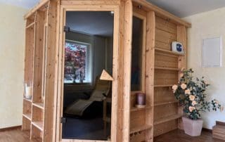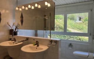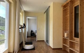 Im Hanggeschoss, das durch einen separaten Eingang zugänglich ist, entstand aus dem ursprünglichen Plan bei Zimmer 2 ein großzügiges Badezimmer mit großer begehbarer Dusche. Angrenzend zum heutigen Badezimmer befindet sich die Sauna mit Ruhebereich. Zwischen der Sauna und dem Zimmer 4 im Plan befindet sich die begehbare Ankleide. So ist hier ein wunderschöner Wohlfühl- und Wellnessbereich entstanden, der abends mit der eingebauten Beleuchtung einem Sternenhimmel gleicht. Auch hier sind alle Fenster mit elektrischen Rollläden ausgestattet.